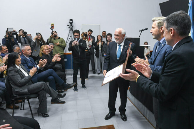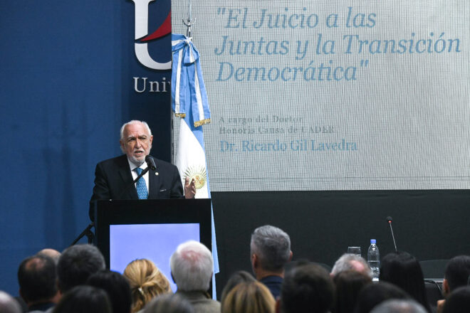 Durante la jornada, Gil Lavedra brindó la conferencia magistral “El Juicio a las Juntas y la Transición Democrática” y recibió plaquetas de la Honorable Cámara de Senadores, de la Cámara de Diputados y del Gobierno de Entre Ríos.