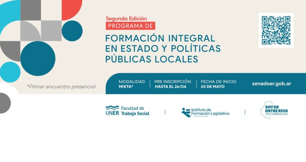 El Programa de Formación Integral en Estado y Políticas Públicas Locales es una propuesta formativa de la Vicegobernación a través del Instituto de Formación Legislativa y la Facultad de Trabajo Social de la Universidad Nacional de Entre Ríos (UNER). Cupo limitado.
